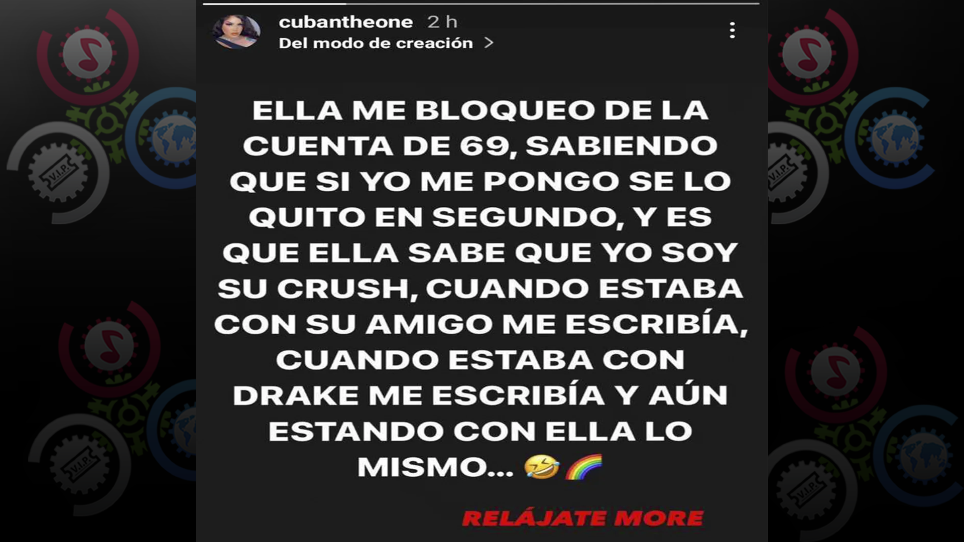 “Ella me bloqueó de la cuenta de 69, sabiendo que si yo me pongo sé lo quito en un segundo, y es que ella sabe que yo soy su crush, cuando estaba con su amigo me escribía, cuando estaba con Drake me escribía y aun estando con ella, lo mismo”, dijo la cubana.