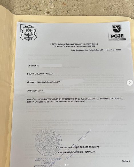 A través de Instagram, confirmó haber presentado una denuncia formal por violencia familiar en la Subprocuraduría de Justicia Alternativa Unidad de Atención Temprana Cabo San Lucas.