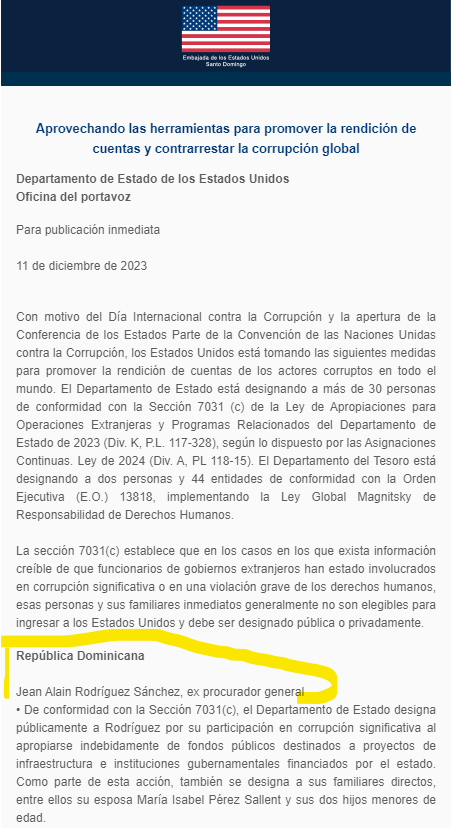 El departamento norteamericano tomó la decisión a propósito de conmemorarse hoy el Día Internacional contra la Corrupción, donde fueron incluidos más de una treintena de personas en un artículo.