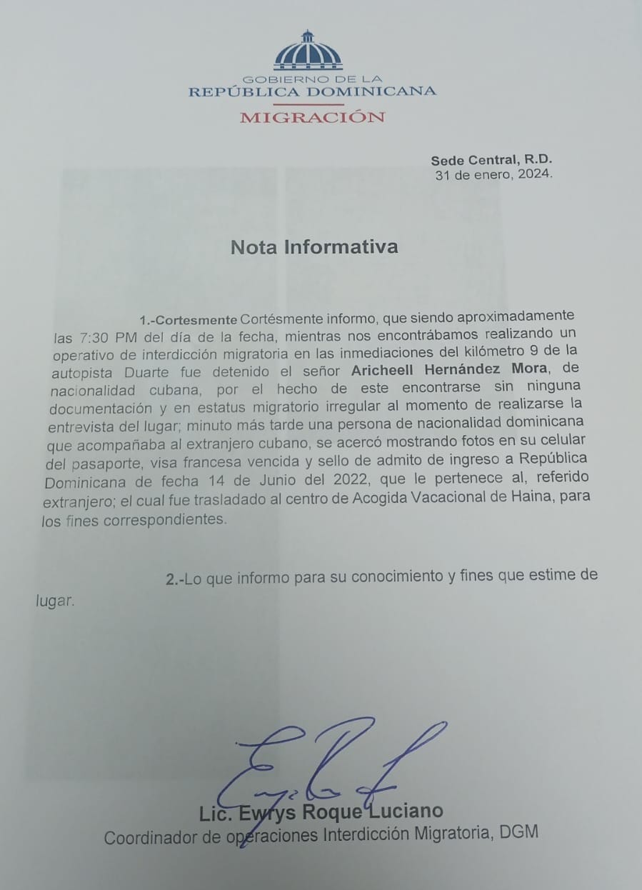 La Dirección General de Migración (DGM), aclaró que la detención del supuesto futbolista Cubano Arichell Hernández Mora, durante un operativo de interdicción migratoria, se realizó a las 7:30 de la noche, en el kilómetro 9 de la Autopista Duarte, y se debió a que el extranjero transitaba sin la debida documentación y no a una confusión con un nacional haitiano.