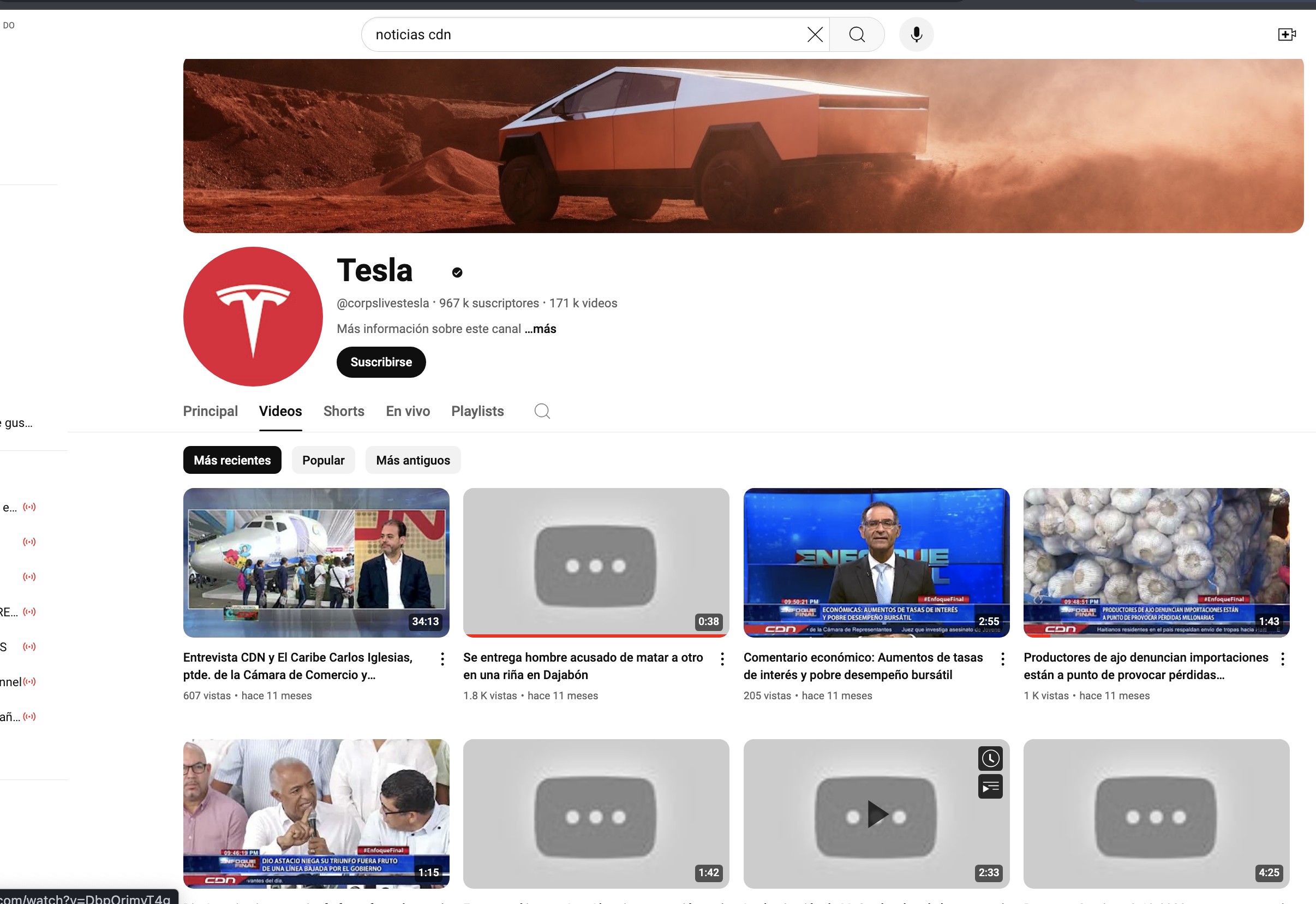 La página oficial de YouTube de la cadena de noticias CDN fue aparentemente hackeada en las últimas horas, generando preocupación entre sus seguidores. La mayoria de los videos del canal fueron eliminados y el logotipo fue reemplazado por el de la compañía automovilística Tesla, además de publicarse varios videos relacionados con dicha empresa.