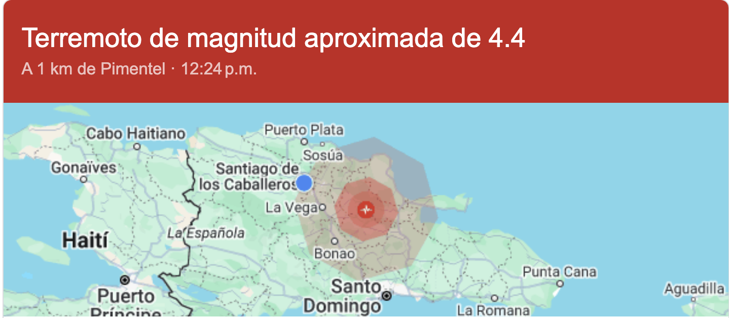 Este mediodía, a las 12:24, se registró un temblor de tierra de magnitud 4.4 con epicentro a 1 km de Pimentel, en las proximidades de Santiago. Usuarios en redes sociales han reportado que el sismo fue sentido en varias localidades cercanas, pero aún no se ha confirmado si el fenómeno se percibió en otras provincias del país.