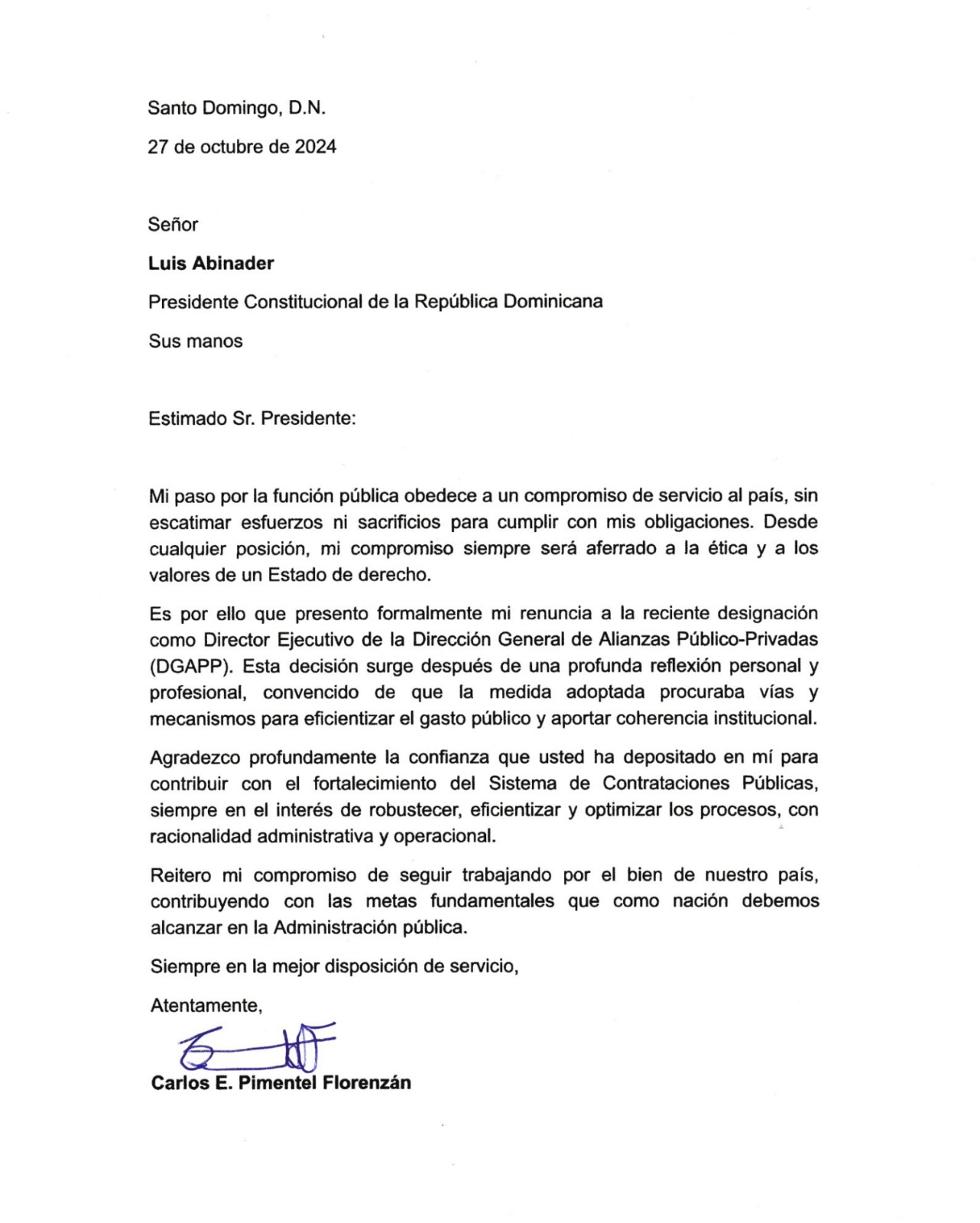 El director ejecutivo de la Dirección General de Alianzas Público-Privadas (DGAPP), Carlos E. Pimentel Florenzán, ha presentado su renuncia al cargo que ocupó recientemente. En una carta dirigida al presidente de la República Dominicana, Luis Abinader, con fecha 27 de octubre de 2024, Pimentel expuso las razones detrás de su decisión, destacando su compromiso con los valores de un Estado de derecho y su deseo de contribuir a la eficiencia y transparencia en el manejo de los recursos públicos.