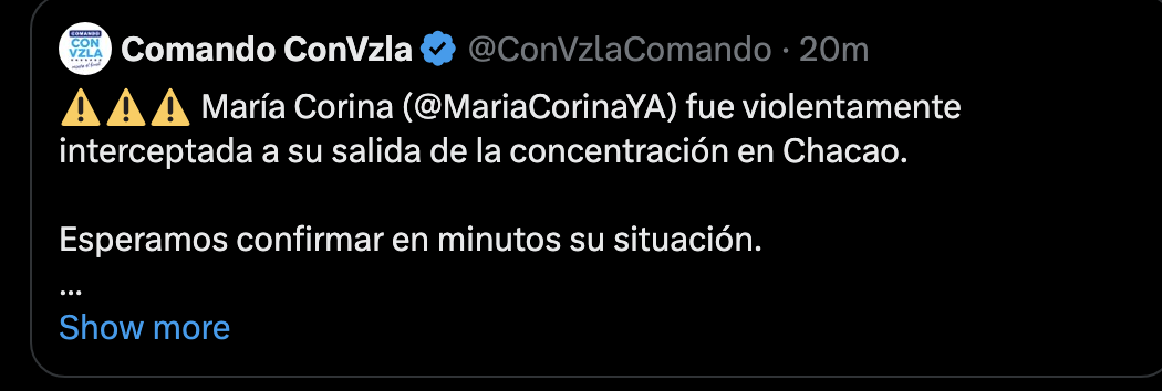 Sin embargo, horas después de su aparición pública, se reportó que Machado fue interceptada por las autoridades venezolanas. Hasta el momento, se desconoce su paradero y más detalles sobre su situación, lo que ha generado preocupación entre sus seguidores y dirigentes de la oposición. El evento ha intensificado las tensiones políticas en el país, mientras diversas organizaciones internacionales exigen garantías para la integridad de la líder opositora.