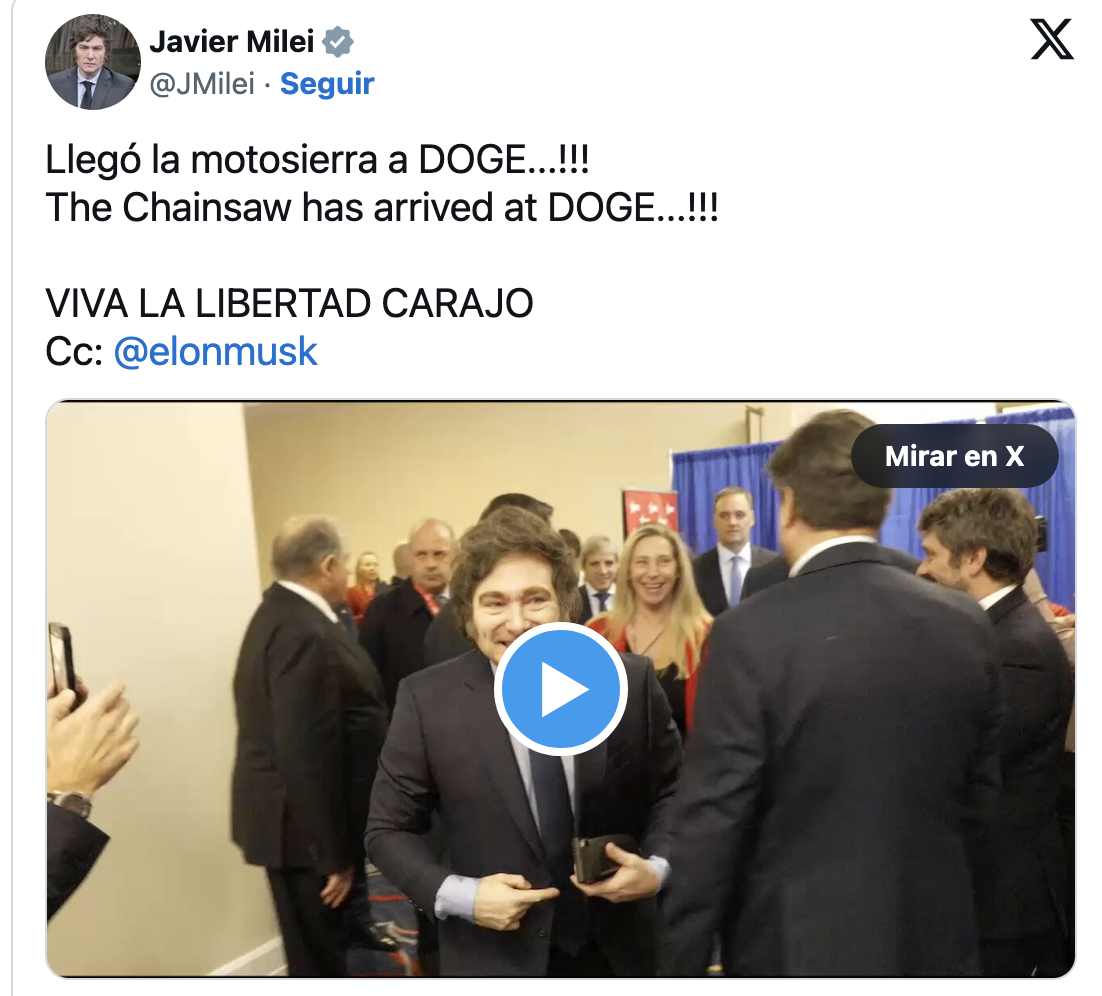 Milei, visiblemente efusivo, saludó a Musk con un “¡Hola, mi amigo!”, y se fundió en un abrazo con el CEO de Tesla y SpaceX, mientras sus colaboradores observaban el momento. En un mensaje publicado en su cuenta de X, Milei escribió: “¡Llegó la motosierra a DOGE”, refiriéndose al Departamento de Eficiencia Gubernamental que lidera Musk, encargado de reducir y reformar el gobierno federal estadounidense. El presidente argentino también destacó el lema “Viva la libertad, carajo”, en alusión a la austeridad que impulsa en su gobierno.