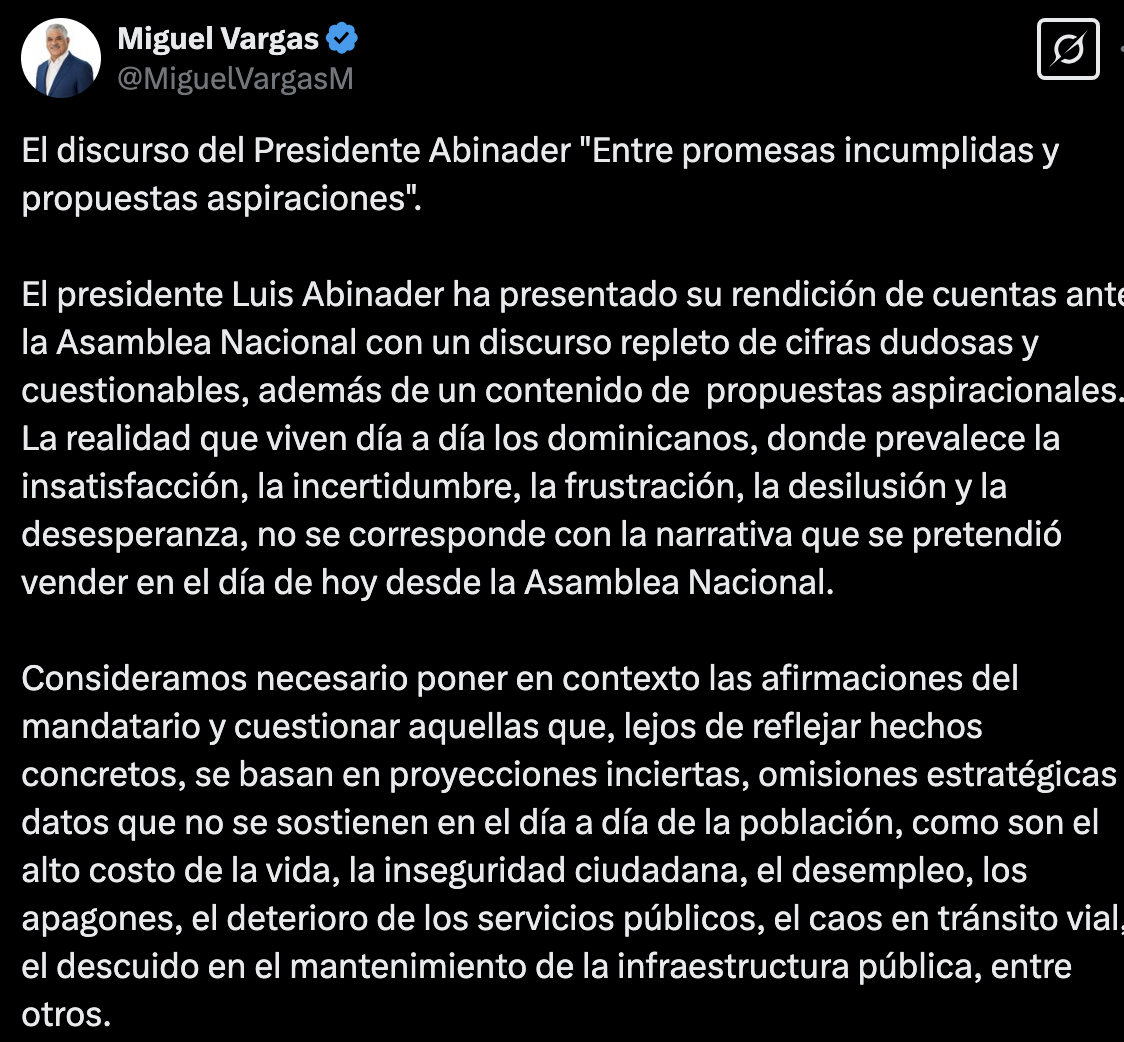 “La realidad que viven día a día los dominicanos, donde prevalece la insatisfacción, la incertidumbre, la frustración, la desilusión y la desesperanza, no se corresponde con la narrativa que se pretendió vender en el día de hoy desde la Asamblea Nacional”, expresó Vargas Maldonado.
