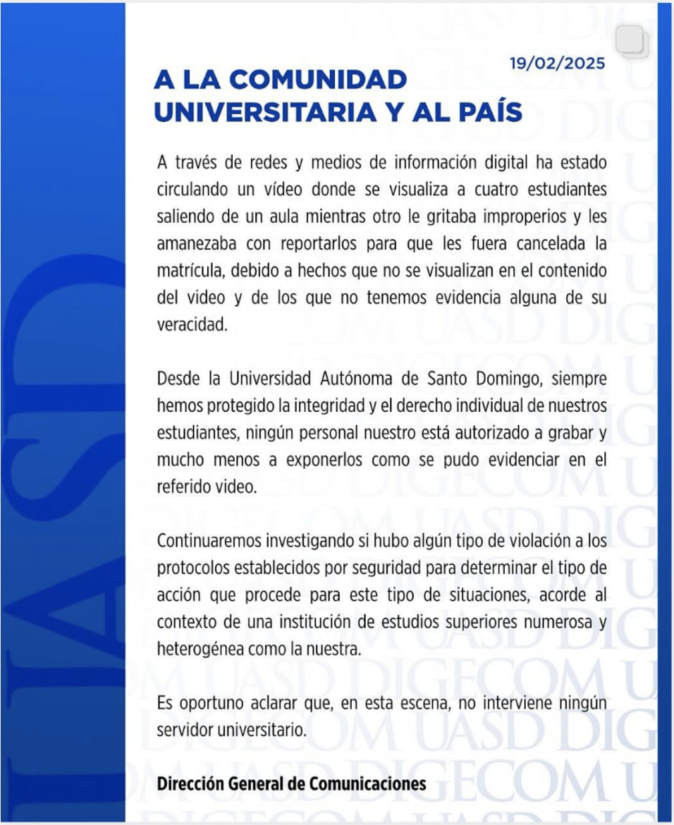 La institución también hizo hincapié en que ningún miembro del personal está autorizado a grabar o divulgar imágenes de estudiantes sin su consentimiento, subrayando que esta práctica va en contra de sus políticas internas. En ese sentido, la UASD adelantó que se realizará una investigación exhaustiva para esclarecer los hechos y determinar si hubo alguna infracción a los protocolos de seguridad establecidos.