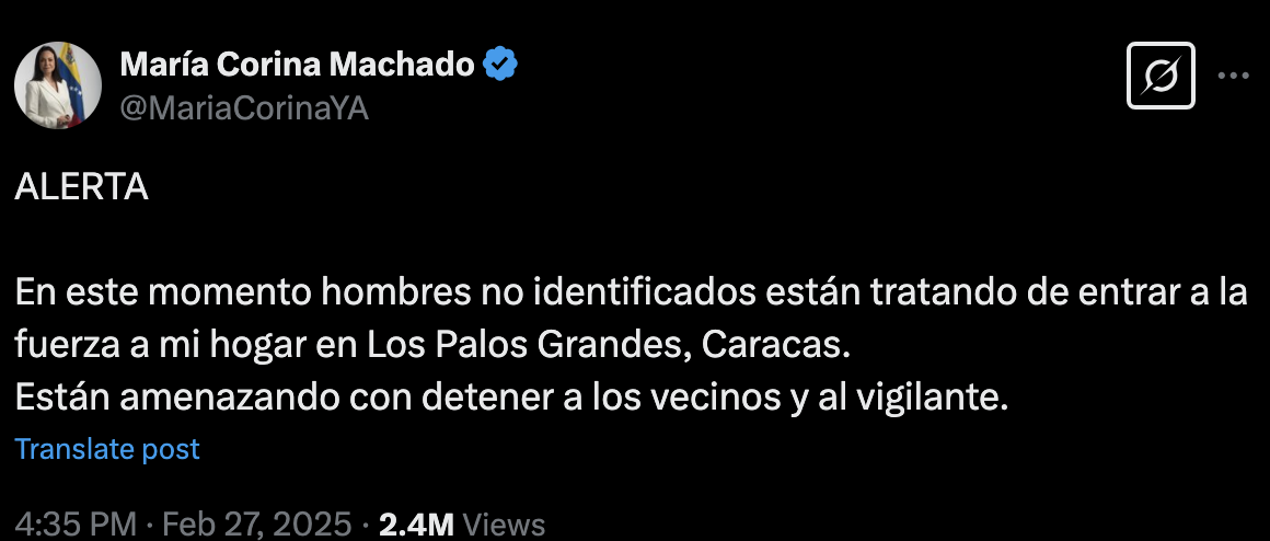 Machado publicó un mensaje en sus redes sociales en el que expresó: “En este momento hombres no identificados están tratando de entrar a la fuerza a mi hogar en Los Palos Grandes, Caracas. Están amenazando con detener a los vecinos y al vigilante”. Junto a este mensaje, compartió dos fotografías en las que se pueden ver a cuatro personas, aparentemente tres hombres y una mujer, acercándose a un vehículo estacionado sin matrícula en la parte trasera, lo que ha levantado más sospechas sobre la identidad y las intenciones de los individuos.
