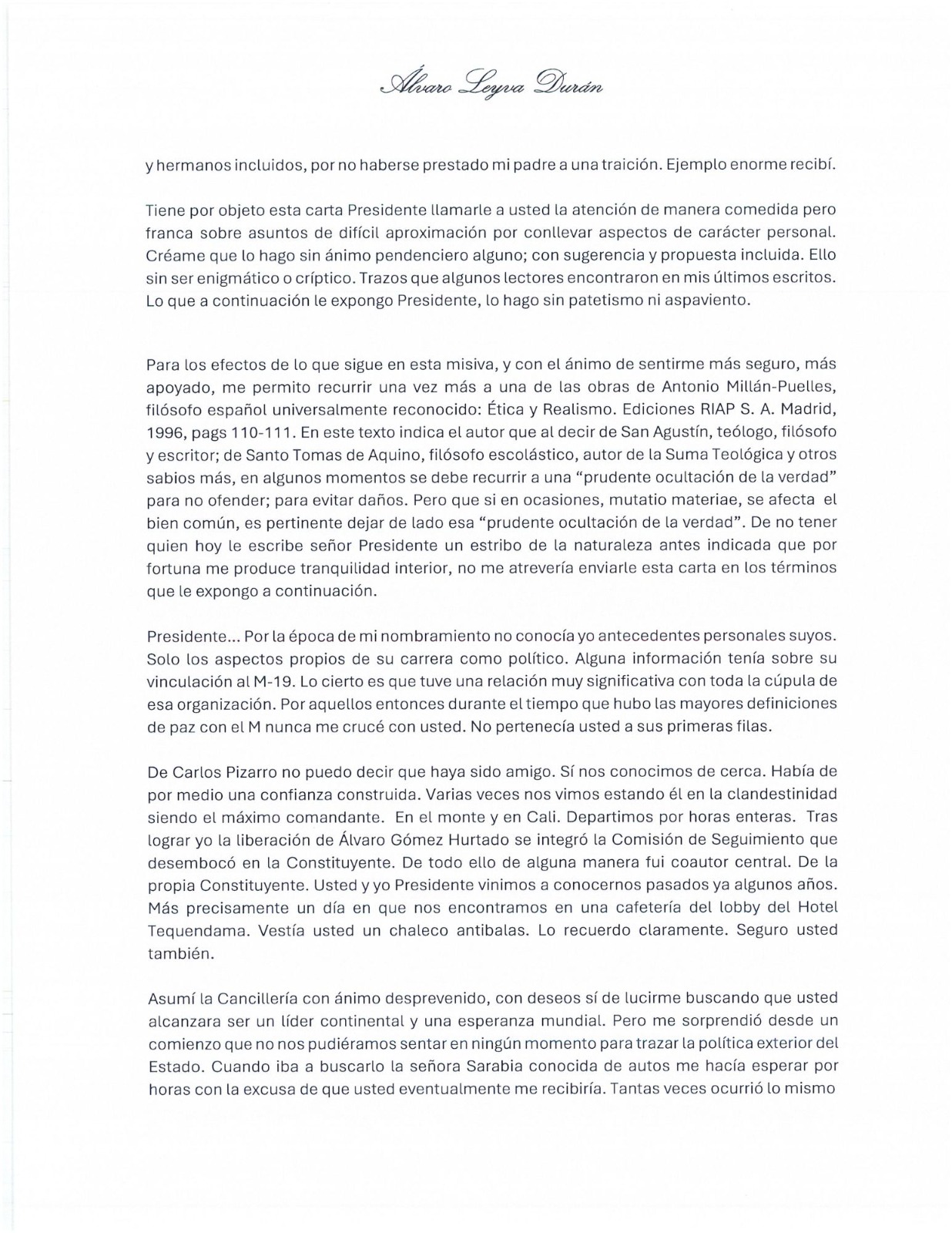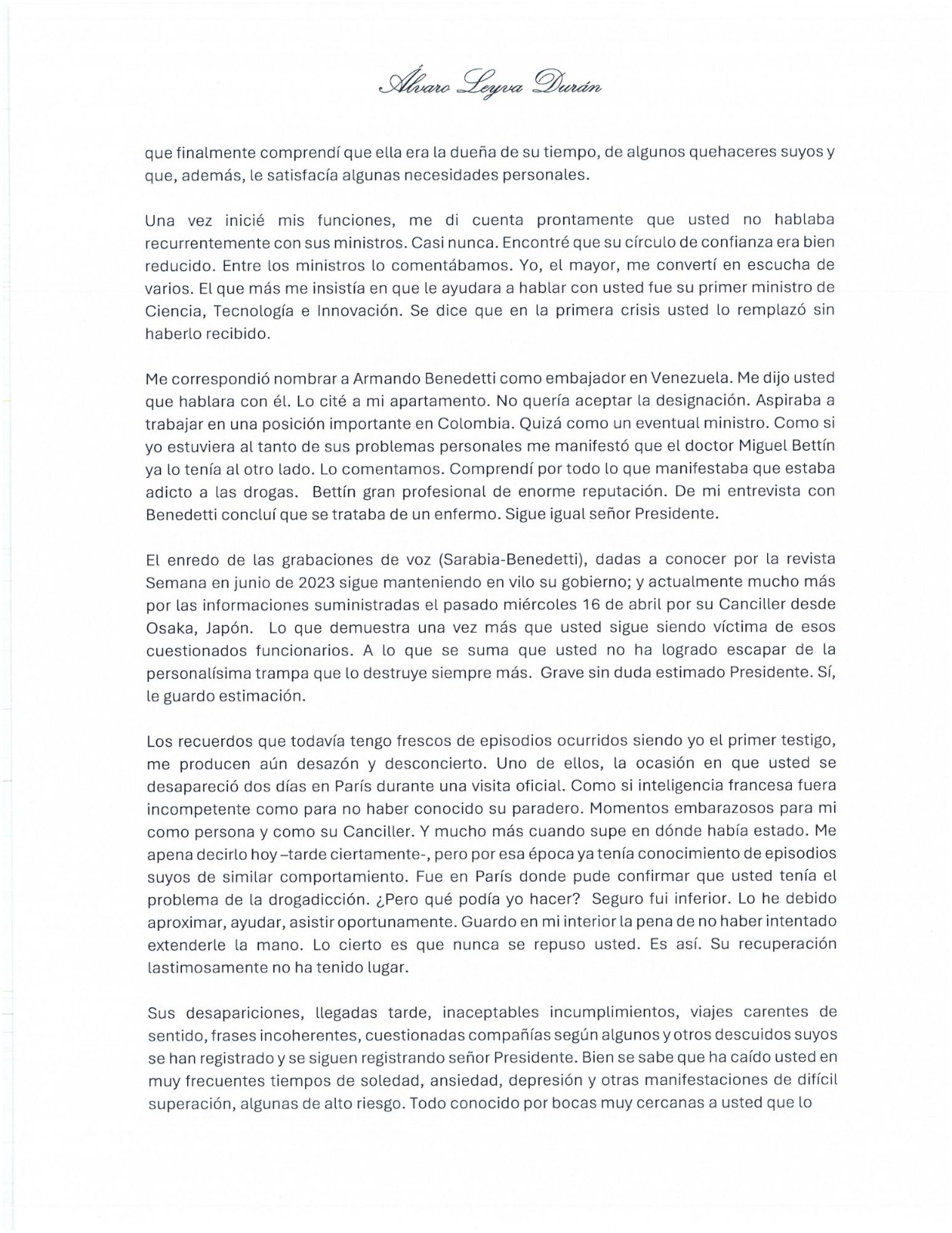 El excanciller colombiano Álvaro Leyva Durán, arremetió contra el presidente Gustavo Petro, al que acusó públicamente este miércoles de padecer una adicción a las drogas que, según afirma, afecta su capacidad de gobernar y lo habría llevado a cometer abusos de poder. La grave denuncia fue publicada en una carta de cuatro páginas, en la que Leyva también arremete contra los dos funcionarios más cercanos al mandatario: Armando Benedetti, actual ministro del Interior, y Laura Sarabia, canciller.