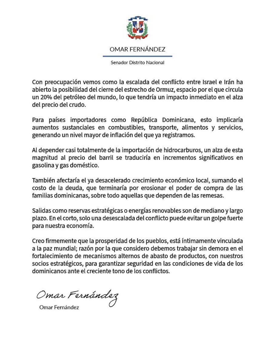 El senador del Distrito Nacional, Omar Fernández, expresó este lunes su preocupación por la escalada del conflicto entre Israel e Irán con el cierre de Ormuz, y advirtió sobre las consecuencias económicas que podría acarrear para países importadores de petróleo como la República Dominicana.