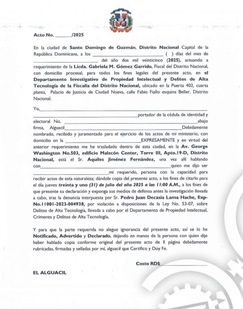 La denuncia fue interpuesta ante el Departamento Investigativo de Propiedad Intelectual y Delitos de Alta Tecnología de la Fiscalía del Distrito Nacional, bajo la coordinación de la fiscal Gabriela M. Gómez Garrido.
