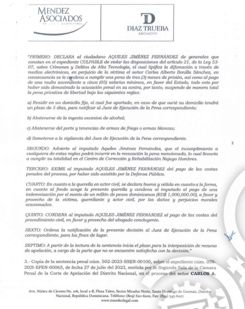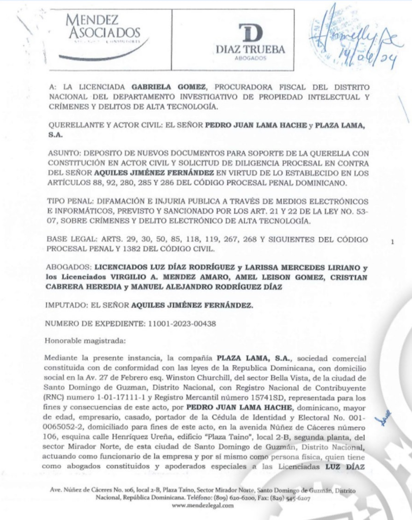 La empresa Plaza Lama y su representante legal, el empresario Pedro Juan Lama, presentaron una querella formal con constitución en actor civil contra Aquiles Jiménez, a quien acusan de supuesta difamación e injuria pública utilizando medios electrónicos.
