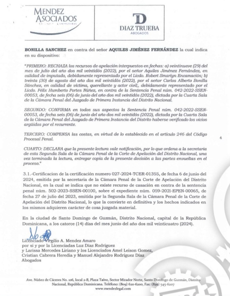 Como parte del proceso legal, el Ministerio Público ha citado al señor Jiménez Fernández para comparecer el próximo jueves 31 de julio a las 11:00 de la mañana, en el Palacio de Justicia de Ciudad Nueva, con el objetivo de ofrecer su declaración y ejercer su defensa frente a las acusaciones presentadas.