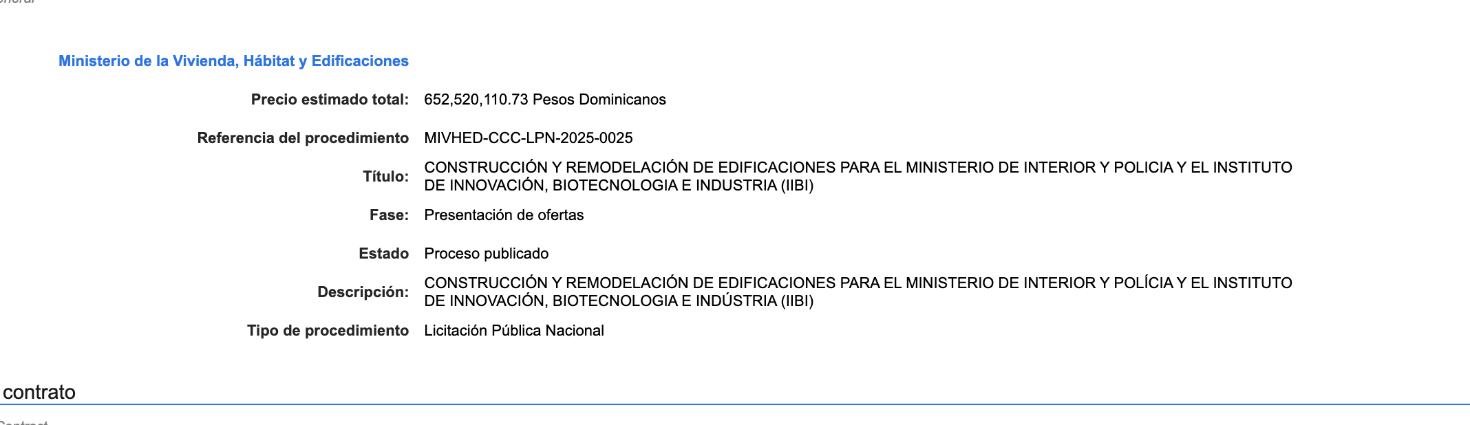 La licitación, cuyo monto total asciende a RD$652,520,110.73, contempla la mudanza de las oficinas de Interior y Policía hacia el mismo edificio del IIBI. Del total presupuestado, RD$13,050,402.21 corresponden al año 2025. Los interesados pueden descargar gratuitamente el Pliego de Condiciones Específicas a través del sitio web del MIVIED o mediante el Sistema Electrónico de Contrataciones Públicas (SECP).
