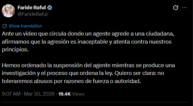 Ante la situación, Raful informó que fue ordenada la suspensión inmediata del agente involucrado, como parte de las medidas adoptadas por las autoridades para garantizar una respuesta oportuna y transparente.