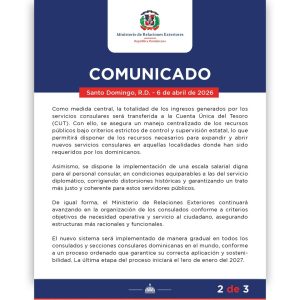 Con esta decisión, se elimina el modelo anterior de manejo de fondos consulares, estableciendo que todos los ingresos serán centralizados por el Estado dominicano, con el objetivo de garantizar mayor control y eficiencia en su administración.