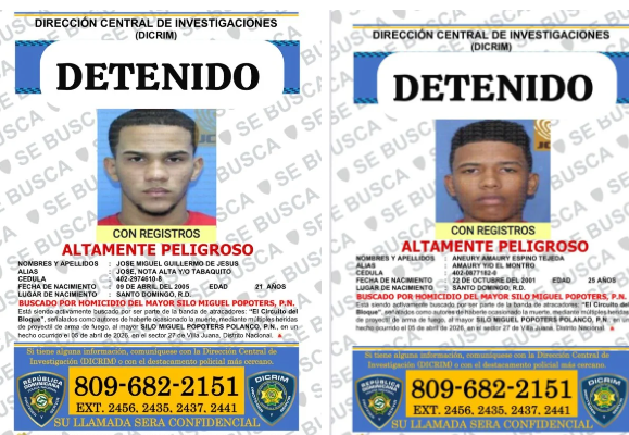 Dos de los presuntos integrantes de la banda delictiva conocida como “El Circuito del Bloque” se entregaron este lunes a la Policía Nacional, tras ser vinculados a la muerte a tiros del mayor policial Silo Miguel Popoters Polanco, hecho ocurrido en el sector Villa Juana.